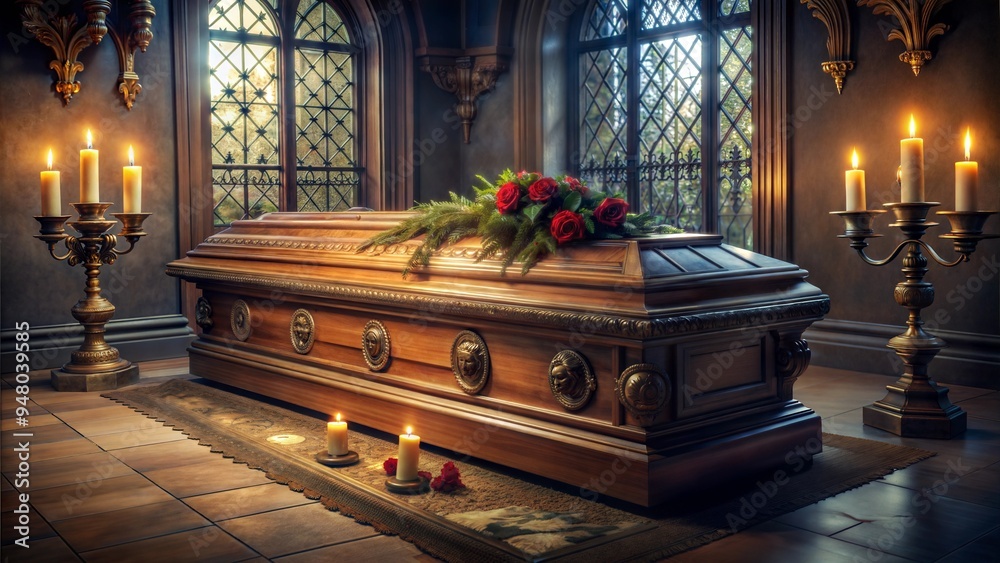 Eichenholzsarg mit Schnitzereien und Bronzeverzierungen